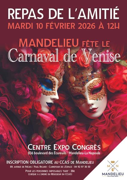 Comme chaque année, afin de partager un moment de détente et de convivialité, le CCAS organise le Repas-Spectacle de l’Amitié sur le thème "Mandelieu-La Napoule fête le Carnaval de Venise", mardi 10 février 2026 à 12h au Centre Expo Congrès de Mandelieu-La Napoule.