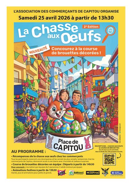 Au programme : animations, stands et jeux pour petits et grands, dans une ambiance conviviale. Les enfants participeront à la chasse aux oeufs, suivie d’une distribution de chocolats, puis d’une loterie permettant de remporter de nombreux lots. Grande nouveauté de cette édition : la course de brouettes décorées, en équipes, avec un départ prévu à 14h30, promettant un moment ludique et original pour les participants comme pour le public. Un événement familial, organisé par les commerçants de Capitou, pour partager un temps fort avec les habitants, dans l’esprit des fêtes de village d’antan.